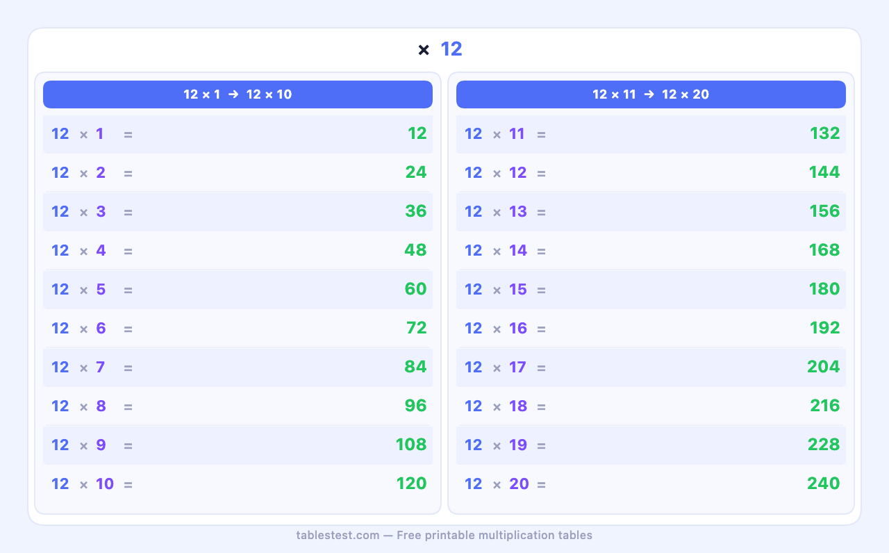 Impara la tabellina del 12 — da 12×1 a 12×20