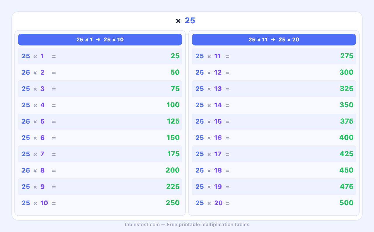 Impara la tabellina del 25 — da 25×1 a 25×20