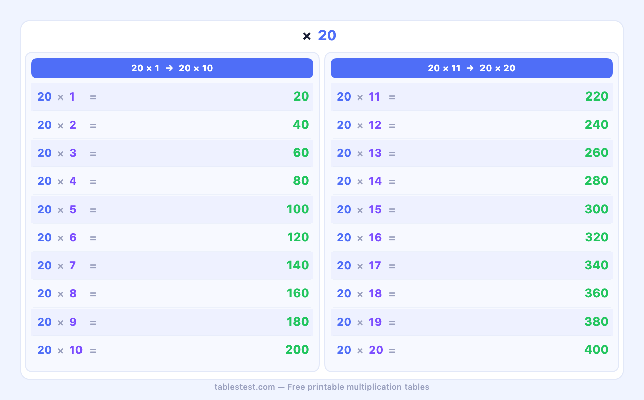 Aprende la tabla del 20 — de 20×1 a 20×20