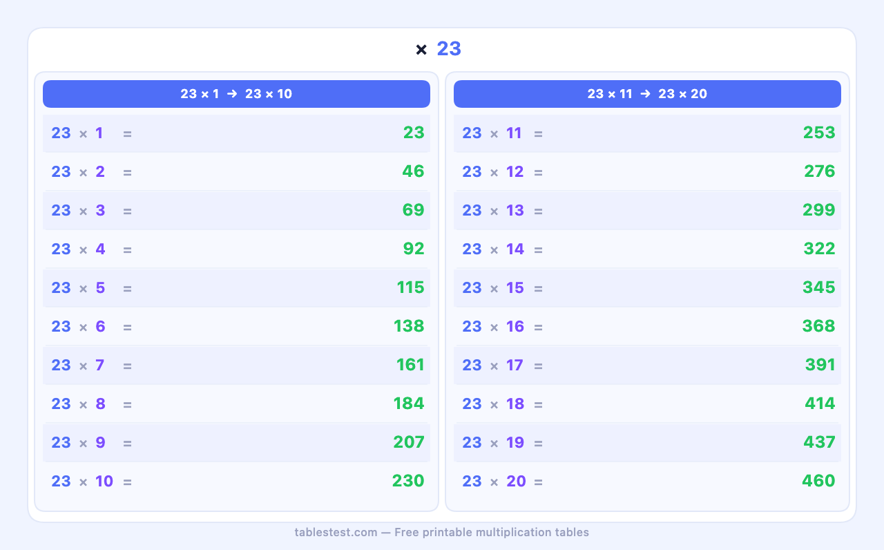 Aprende la tabla del 23 — de 23×1 a 23×20