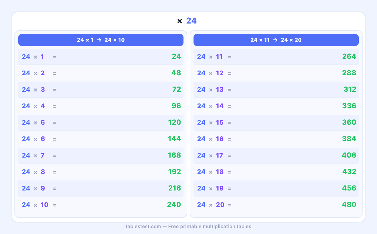 Aprende la tabla del 24 — de 24×1 a 24×20