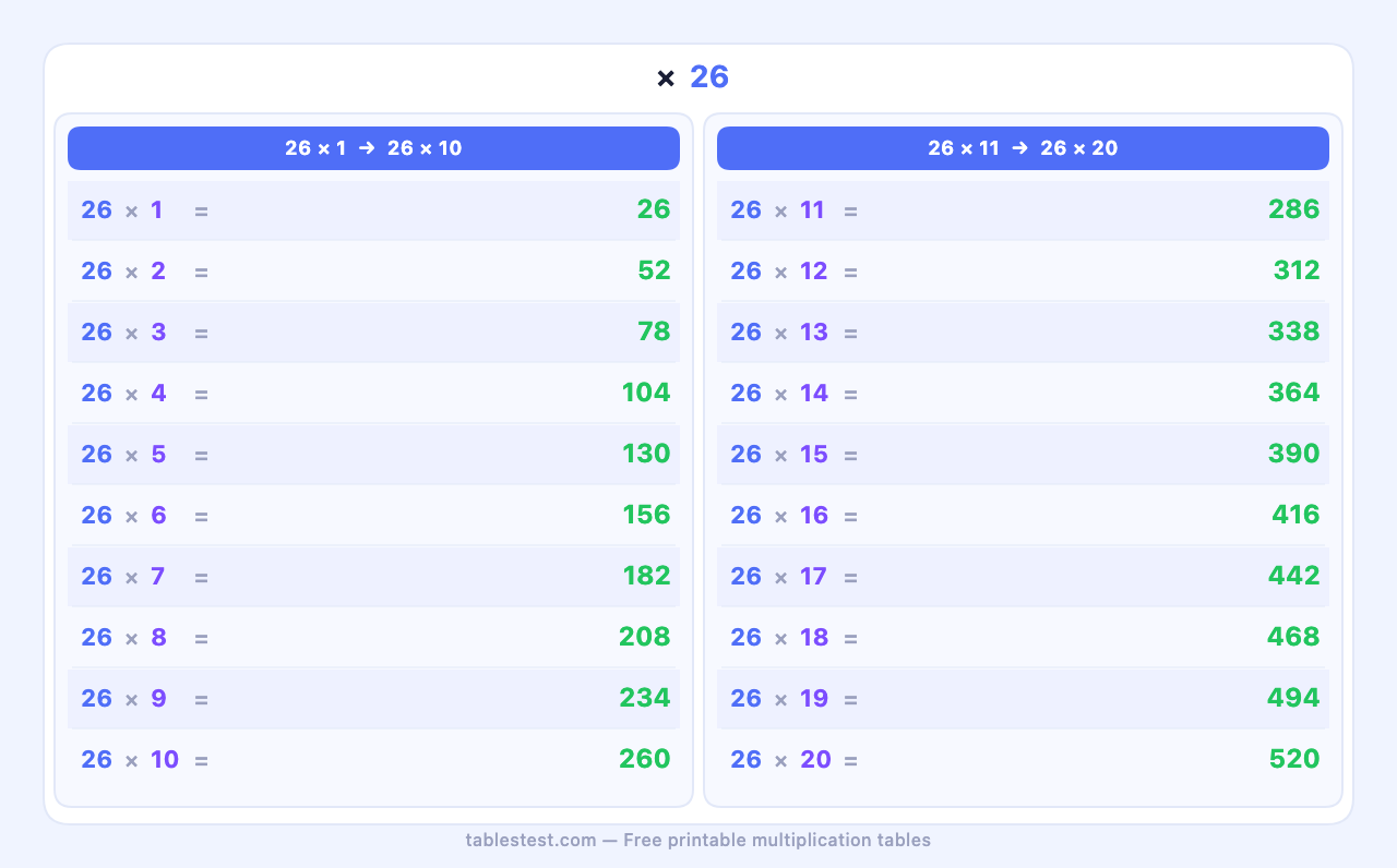 Aprende la tabla del 26 — de 26×1 a 26×20