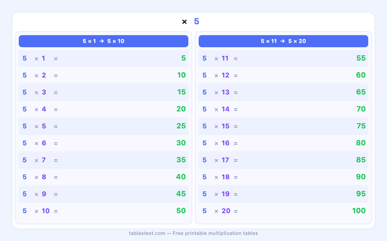 Learn the 5 times table — from 5×1 to 5×20