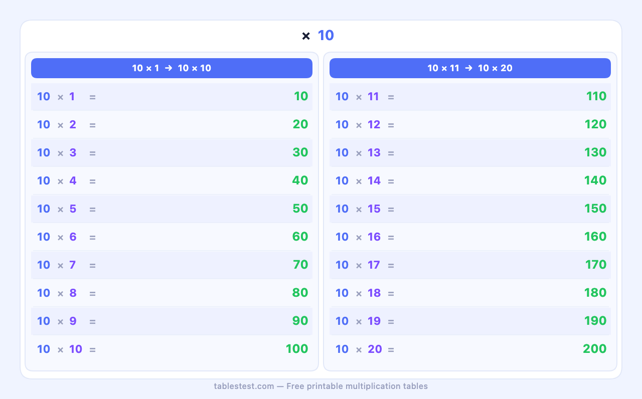 Aprenda a tabuada do 10 — de 10×1 a 10×20