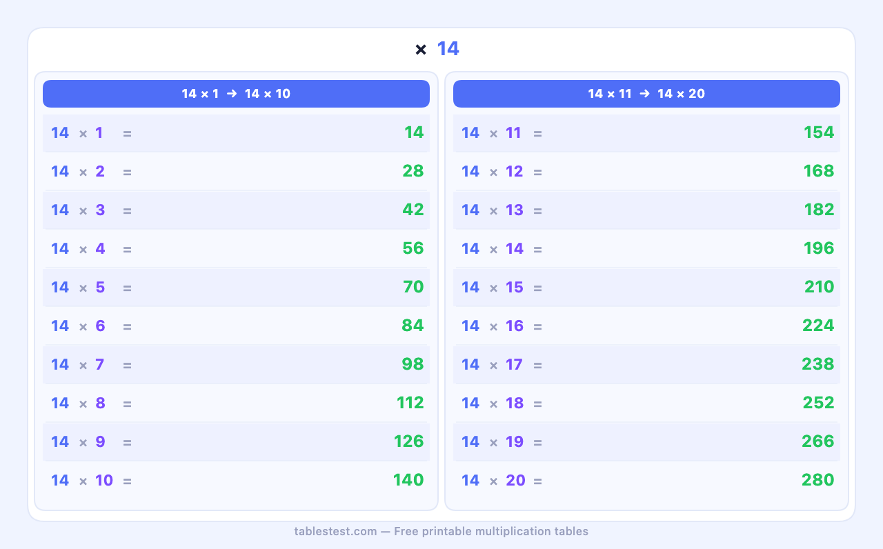 Aprenda a tabuada do 14 — de 14×1 a 14×20