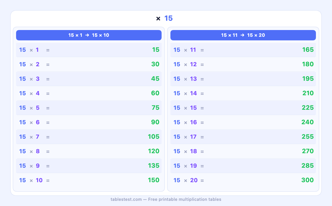 A tabuada do 15 é essencial para o cálculo mental. Pratique 5–10 minutos por dia e use jogos de velocidade como TablesTest para tornar o recall automático.