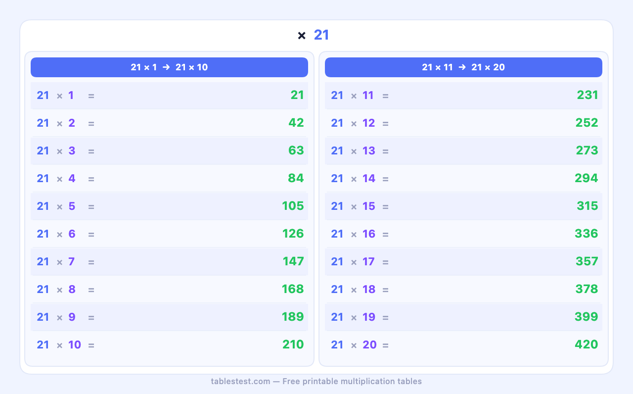 Aprenda a tabuada do 21 — de 21×1 a 21×20