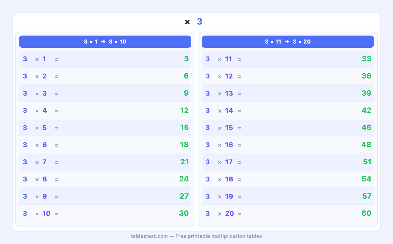 Aprenda a tabuada do 3 — de 3×1 a 3×20